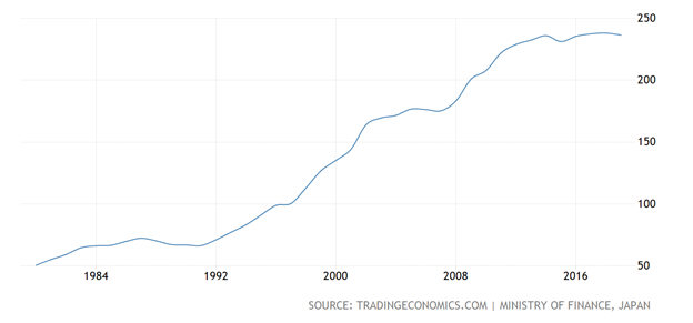 Und nein, eine Zentralbank, die den ganzen stinkenden Haufen monetisiert, ist kein Allheilmittel. Wir wissen bereits, wie sich diese Geschichte abspielt. Ein Paradebeispiel für dieses Experiment uneingeschränkter fiskal- und geldpolitischer Lasterhaftigkeit findet sich in Japan. Das japanische Schulden-BIP-Verhältnis soll bis Ende 2020 auf 250% steigen.