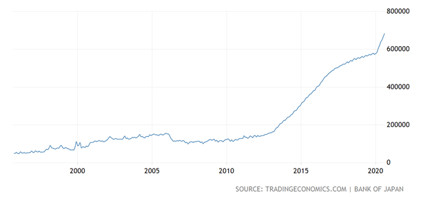 Die Bilanz der Bank of Japan ist seit 2000 in die Höhe geschnellt, als die BoJ dazu verleitet wurde, die Hälfte aller japanischen Staatsanleihen frenetisch zu erwerben.