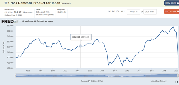 Währenddessen hat Japans Kreditaufnahme und Gelddruckerei das BIP der Nation praktisch unverändert gelassen.