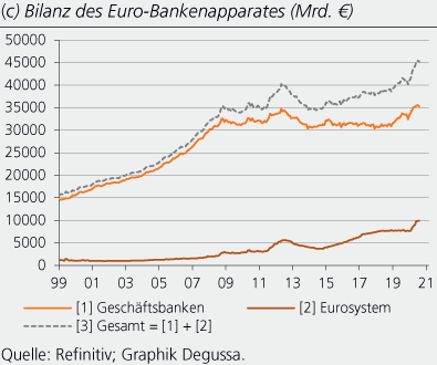 Die fortgesetzten Anleihekäufe der Europäischen Zentralbank (EZB) und ihre ausgeweitete Kreditvergabe an Euro-Banken hat ihre Bilanzsumme auf 6.743 Mrd. Euro anschwellen lassen (Abb. b). Durch Anleihekäufe und einem negativen Einlagezins hat die EZB die Langfristzinsen in die Tiefe gezogen; die Rendite der 10-jährigen Bundesanleihe liegt derzeit bei minus 0,5%. Die Bilanz des Bankensektors im Euroraum (Zentralbanken plus Geschäftsbanken) schwillt immer weiter an und hat mittlerweile einen Rekordstand erreicht (Abb. c). Sowohl die Europäische Zentralbank trägt dazu bei als auch die privaten Geschäftsbanken.