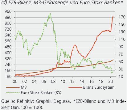 Auffällig ist, dass die EZB ihre Bilanzsumme ausweitet, während die Euro-Bankaktien im Sinkflug sind (Abb. d). Ein mögliches Indiz, dass die EZB-Geldpolitik vor allem darauf ausgerichtet ist, die Euro-Bankensektor über Wasser zu halten (und zwar "Whatever it takes").