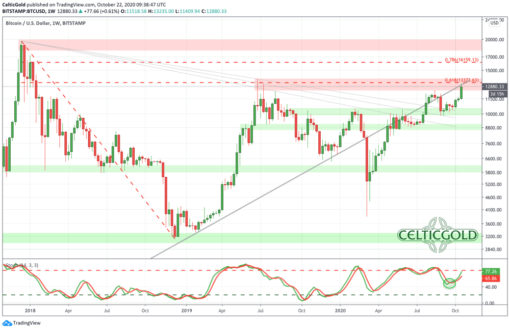 Getrieben von einer sich weiter verbessernden charttechnische Lage sowie zahlreichen sehr positiven Entwicklungen (Raoul Pal: The Bitcoin Life Raft) sowie günstigen fundamentalen Nachrichten (Microstrategy, PayPal) konnte der Bitcoin so in den letzten zwei Wochen weiter steigen und am 21. Okotber schließlich die runde Marke von 12.000 USD ohne große Probleme überspringen. Damit hat sich das technische Bild deutlich verbessert.