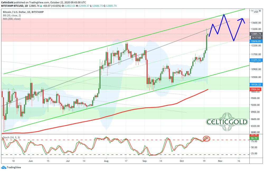 Dementsprechend ziehen die Notierungen in den letzten drei Tagen stark an und Bitcoin erreichte gestern mit 13.225 USD den höchsten Stand seit Anfang Juli 2019! Zum Ausbruch über das Hoch vom Sommer 2019 bei 13.800 USD und dem dann vermutlich folgenden Run auf das Allzeithoch bei 20.000 USD fehlt also nicht mehr viel.