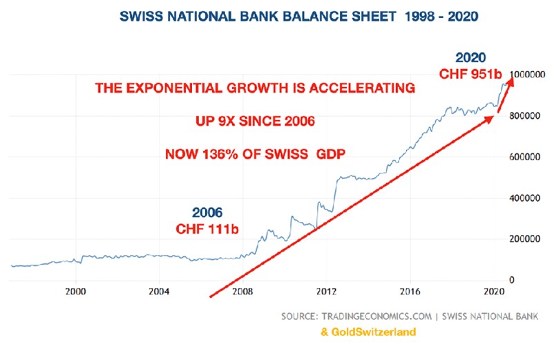 Die Bilanzen der globalen Zentralbanken explodieren, mit desaströsen Konsequenzen. Und die Schweizer Nationalbank (SNB) sticht dabei als der größte "Hedgefonds" und Spekulant der Welt hervor. Die Bilanzsumme der Nationalbank liegt bei über 1 Billion $ - oder aber 136% des Schweizer BIP. Zum Vergleich: Die Bilanzsumme der Fed beträgt 35% des BIP der USA. Um hier mit der SNB zu konkurrieren, müsste die Fed ihre aktuelle Bilanzsumme von 7 Billionen $ auf ganze 27 Bill. $ ausweiten. Das hört sich nach einem großen Sprung an, scheint aber in den kommenden Jahren nicht unwahrscheinlich.
