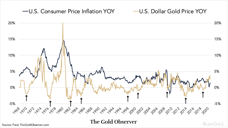 Es gibt genau genommen kein wirtschaftliches Gesetz, das garantiert, dass ein höherer Goldpreis Inflation erschaffen wird. Doch historisch betrachtet war der Goldpreis ein Ausdruck der Inflationserwartungen. Inflationserwartungen sind wiederum das, was in die Inflation einfließt. Wenn der Goldpreis also steigt, dann nimmt die Inflation typischerweise innerhalb ein bis zwei Jahre zu (sieh unterer Chart).