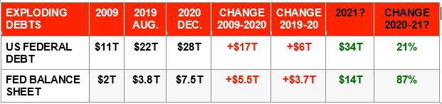 2009, als die Krise angeblich zu Ende war und das Weltfinanzsystem gerettet, lag die US-Verschuldung bei 11 Billionen $ und die Fed-Bilanz betrug nicht mehr als 2 Billionen $. Also gab es eigentlich keinen Grund, noch mehr Geld zu leihen und zu drucken, um die US-Wirtschaft am Laufen und das Finanzsystem solvent zu halten. Immerhin war die Krise vorbei!