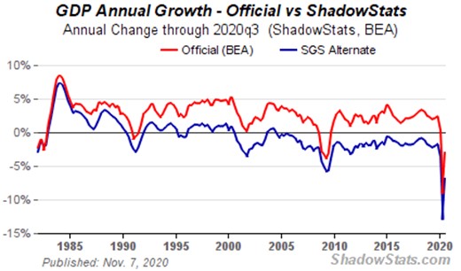 Shadow Statistics liefert dazu eine exzellente Darstellung. In den 2000ern war das reale (d.h. real inflationsbereinigt) BIP negativ - und das in einem Ausmaß von 3-5% pro Jahr. Die offiziellen BIP-Zahlen sind also Fake; sie konnten nur durch konstante Geldschöpfung erreicht werden, mit der das BIP künstlich hoch gehalten und ein Zusammenbruch der US-Wirtschaft verhindert wurde.