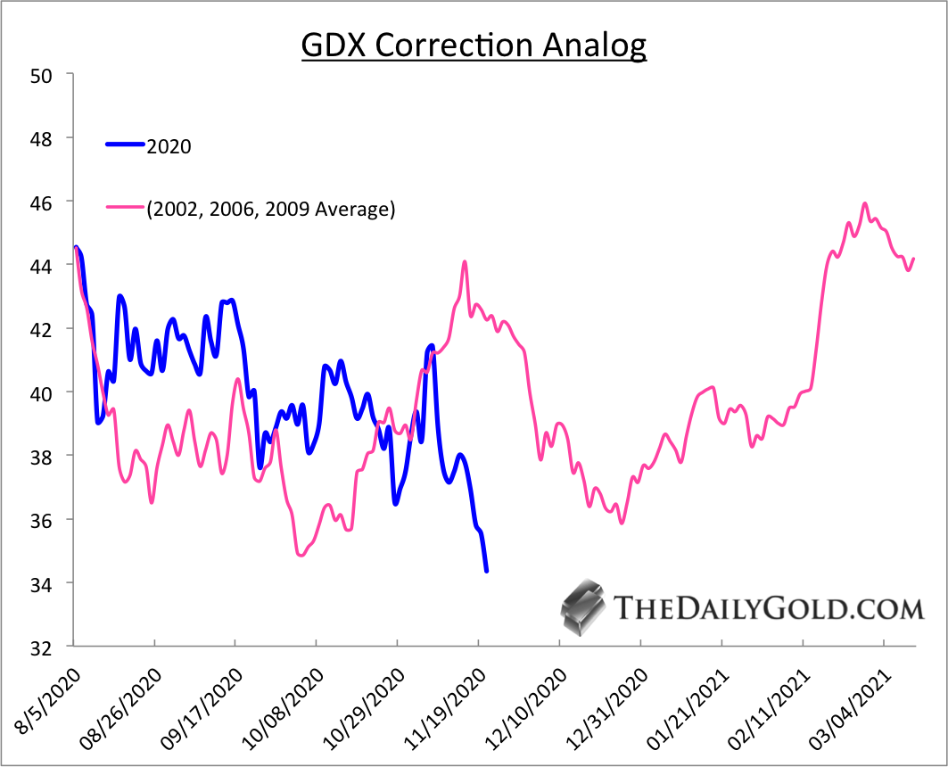 Beachten Sie, dass der GDX eine offene Gap bei 33,55 Dollar hat und dessen 400-tägiger, exponentieller gleitender Durchschnitt bei 32,24 Dollar liegt. Die Korrektur des GDX hat nun den Durchschnitt dieser vergleichbaren Korrekturen erreicht. In Sachen Zeit endeten die Korrekturen im Durchschnitt innerhalb fünf Monate oder im aktuellen Maßstab um Weihnachten herum.