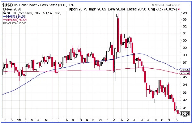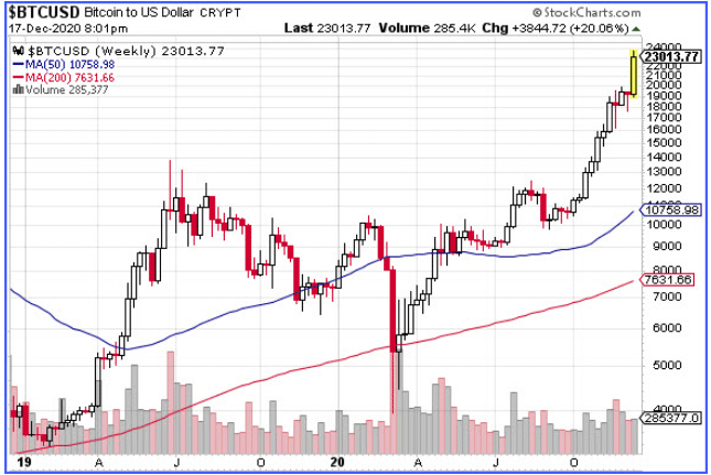 Das ist ein schrecklicher Chart! Doch verdient. Derzeit passiert wirklich nicht viel Gutes für den USD. Die schreckliche US-Wirtschaft wird durch unbedachte Politik und eine schrecklich schlechte Reaktion auf COVID, außer Kontrolle geratenen Ausgaben und einer druckerfreundlichen Federal Reserve zerstört. Rechnet man all dies zusammen, dann gibt es eine Menge USD die herumflattern. Und weniger, für das man sie ausgeben kann. Also sinkt der Dollar. Und während der USD absackt, nehmen andere Assets, die in Dollar bepreist sind, zu. Wie Bitcoin.