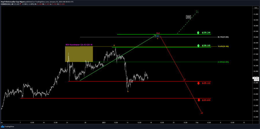 Obwohl der Silberpreis knapp über der Unterstützung von 25,12 $ liegt, erwarten wir, dass er sich über 28,10 $ begibt und um 29 $ zu einer Korrektur ansetzt. Zusammengefasst sehen wir einen leicht anderen Verlauf beim Silber als bei Gold. Silber könnte nochmals kurzfristig ansteigen, bevor es dann in eine mittelfristige Korrektur übergeht.