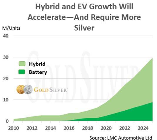 All das ist wichtig, weil fast doppelt so viel Silber in EVs verbaut wird wie in Fahrzeugen mit Verbrennungsmotoren. Hybrid-Vehikel verwenden etwa 22% mehr Silber. Da mehr Silber in EVs und Hybrid-Fahrzeuge verbaut wird, wird die Nachfrage aus dieser Quelle zunehmen. Das prognostiziert Metals Focus für die kommenden Jahre: