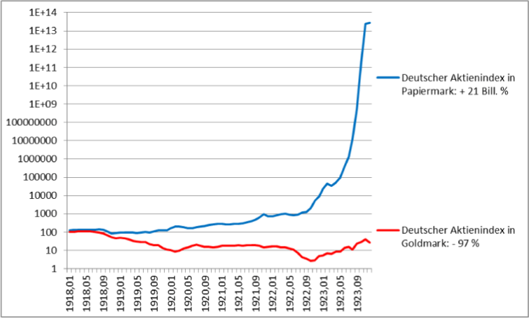 Abb. 1: Deutscher Aktienindex in Papierreichsmark (blau) & Goldreichsmark (rot) von 1918 bis 1923