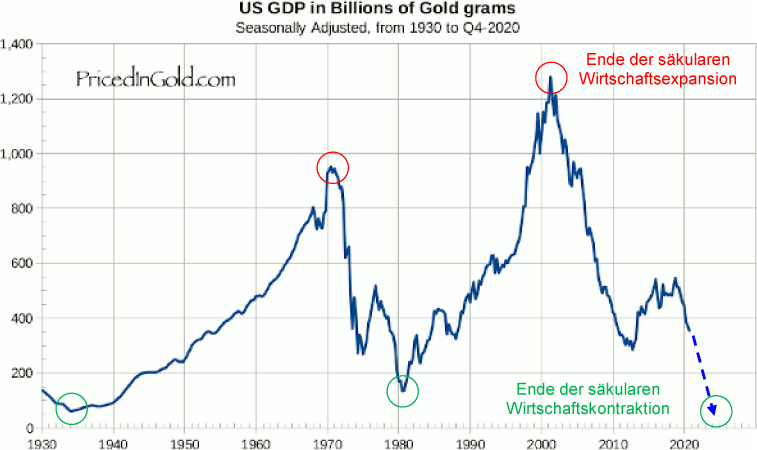 Siehe hierzu den in Gold bewerteten Verlauf des US-BSP, welches, wie der US-amerikanische Aktienmarkt, ebenfalls bereits - seit dem Jahrtausendwechsel (strategisch reales Weltwirtschaftshoch) - mehr als 70 Prozent an Wert verloren hat. Da wir uns im Finale eines Verschuldungs-Superzyklus befinden, sollte das US-BSP (auch die US-Aktienindizes) vom jetzigen Niveau aus real (in Unzen Gold bewertet) nochmals um zirka 80 Prozent verlieren, um auf demselben Stand wie beim letzten epochalen Superzyklus-Tief, Mitte der 1930er Jahre, zu stehen (siehe hierzu Abb. 2)!