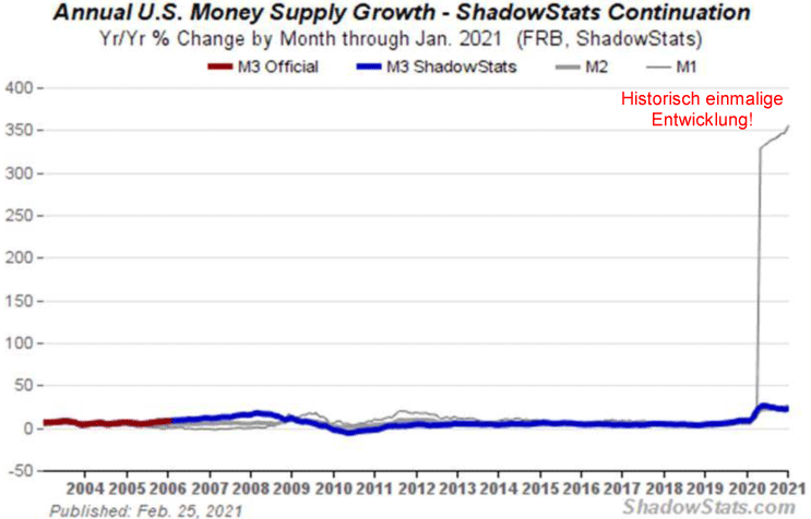 Abb. 3: US-Geldmengenaggregate M1, M2 und M3 von 01/2003 bis 01/2021