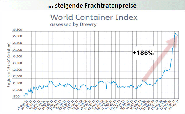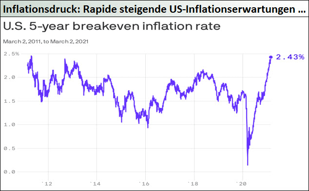 Die jetzt deutlich anziehenden Inflationserwartungen führten zu Renditeanstiegen an den Anleihemärkten respektive herben Kursverlusten bei den "zinslosen Risikopapieren", wobei die Zinsen absolut immer noch auf absurd niedrigen Niveaus notieren. Dass sich die Notenbanken-Gemeinde trotzdem sofort zu - bisher eher fruchtlosen - Verbalinterventionen genötigt sah, zeigt, dass die Notenbanken alles - inklusive der Einführung von Zinsobergrenzen - unternehmen werden, um größeren Zinsanstiegen entgegenzuwirken. Letztlich ist damit ein Absinken der Realzinsen in immer tiefere Negativbereiche vorgezeichnet.