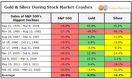 Während keine zwei Selloffs identisch sind, so sind die besten Hinweise darauf, wie sich Gold und Silber vielleicht während des nächsten Crashs entwickeln könnten, in vergangenen Zusammenbrüchen zu finden. Hier eine Auflistung der neun größten Zusammenbrüche des S&P 500 seit Mitte der 1970er Jahre und wie sich Gold und Silber jeweils entwickelten. Grün für Anstiege, gelb für Rückgänge, die geringer ausfielen als die der Aktien und rot für Abnahmen, die stärker ausfielen als die der Aktien.