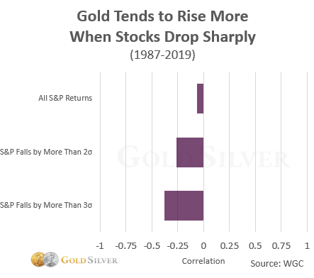 Physisches Gold und Silber besitzen viele großartige Vorteile; einer davon ist die Tatsache, dass sie größtenteils nicht mit anderen Investments korrelieren. In anderen Worten: Wenn eines steigt, fällt das andere tendenziell. Das macht bei genauerem Überlegen Sinn. Aktien profitieren von Wirtschaftswachstum und Stabilität, während Gold von wirtschaftlichen Unruhen und Krisen profitiert. Wenn der Aktienmarkt fällt, ist die Angst üblicherweise stark und Investoren sind dann typischerweise auf der Suche nach dem sicheren Hafen Gold.