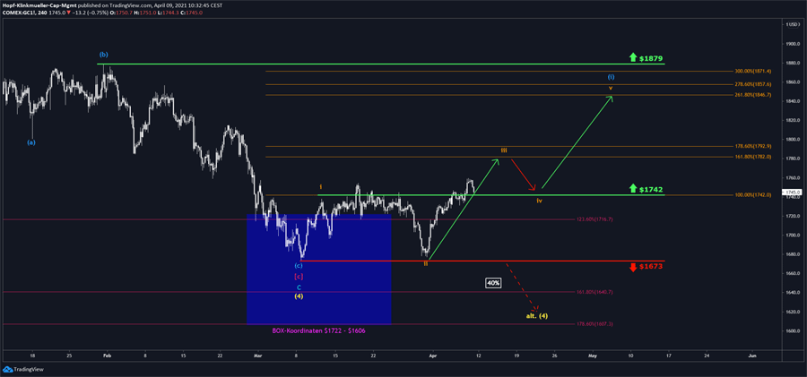 Ein dickes Lob geht hier an die Bullen des Goldmarktes, die sich tapfer zurückgekämpft haben und die Lethargie nach Erreichen des Zielbereichs abgeschüttelt zu haben scheinen. Der Goldpreis befindet sich nun oberhalb des Widerstandes von 1742 $, der aber noch nicht ganz überwunden ist. Zwar scheinen sich die Bullen hier drüber breitzumachen, aber wir wollen es nicht voreilig als abgeschlossen sehen. Primär erwarten wir, dass der Goldpreis sich über 1742 $ hält und seine Bewegung bis um 1782 $ fortsetzt. Dort wartet eine kleinere Korrektur auf uns, und im Anschluss sollte der Kurs dann aber wieder bullisch weitermachen.