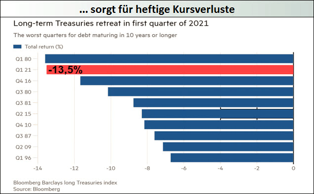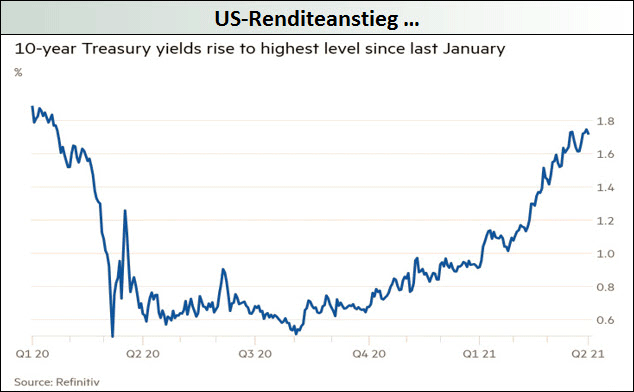 Ob nun Fed oder EZB, beide billionenfach US-Dollars bzw. Euros aus dem Nichts erzeugenden Notenbanken sind sich darin einig, auf den Anstieg der Teuerungsraten nicht reagieren zu wollen, sondern "geduldig" zu bleiben oder, wie es die EZB-Chefin Lagarde sagte, "durch die Inflation hindurchzuschauen". Die im Zuge der gestiegenen Inflationserwartungen erfolgten kräftigen Renditeanstiege will die EZB allerdings einbremsen, indem sie ihre inflationäre - die Renditen treibende - Geldpolitik nochmals intensiviert!