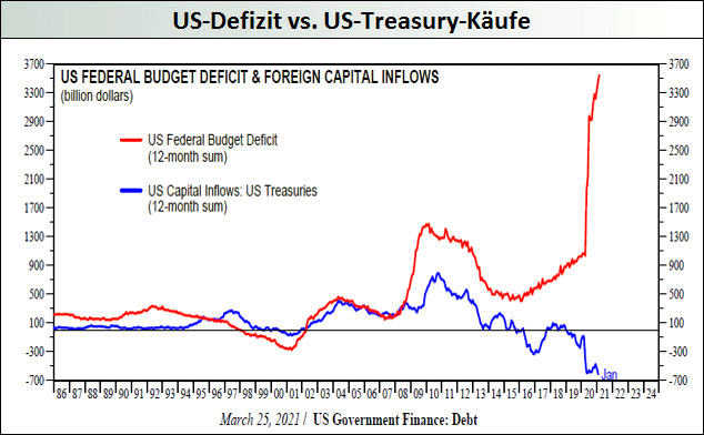 Auch die Fed zeigt sich angesichts des kräftigen Renditeanstiegs zunehmend nervös, wie es die aufkeimenden Diskussionen zur Kontrolle der Zinskurve zeigen. Allerdings sitzen die stark auf ausländische Kapitalgeber angewiesenen USA dabei in einer Zwickmühle, denn sollten sie ihren Gläubigern keine attraktiven, sondern stattdessen nur noch »gemanagte« Tiefst-Renditen bieten, dürften sich ausländische Investoren weiter zurückziehen, was wiederum die Weltleitwährung deutlich belasten sollte.