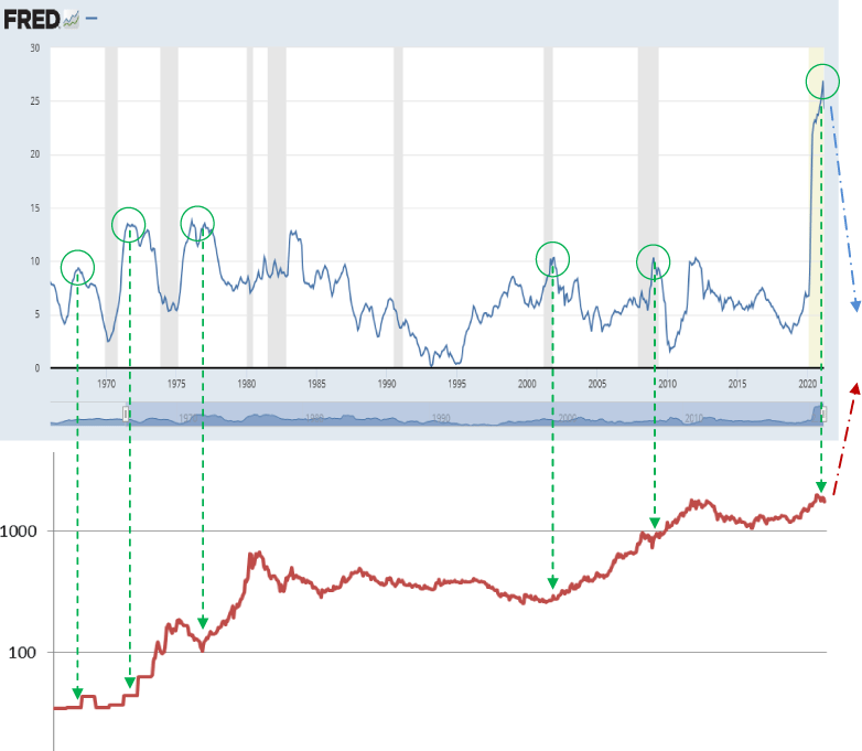 Abb. 2: US-M2 Change from Year Ago (oben blau) vs. Gold in USD/oz (unten rot) von 01/66 bis 03/21