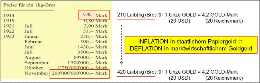 "… Wer sich mit der Finanzgeschichte beschäftigt, der weiß, was die Folge dieser "Politik der Notenpresse" war: Der Alptraum der Weimarer Hyperinflation, welcher extremstes Elend und Millionen von Hungertoten verursachte. Bis zu Beginn des Jahres 1923 wurde der Preisanstieg bei Vermögenswerten und Löhnen als Erfolg der Wirtschafts- und Geldpolitik gefeiert. Erst im Finale, als es plötzlich nicht mehr möglich war, mit seinem Lohn auch nur die Grundbedürfnisse zu befriedigen, wachte das deutsche Volk - in Armut und Elend – auf …"