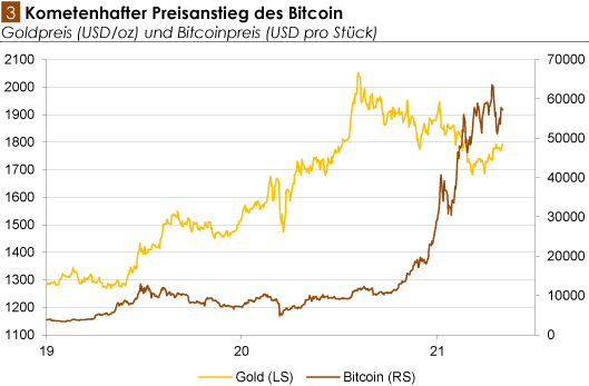 Zum Vergleich Die Goldproduktion in 2020 belief sich auf einen Marktwert von etwa 187 Mrd. US-Dollar. Während der Goldpreis ab August 2020 - vor allem auch durch die steigenden Zinsen - abnahm, vollzog der Bitcoin seinen kometenhaften Preisanstieg (siehe Abb. 3). Und es ist nicht von der Hand zu weisen, dass es dabei erhebliche Umschichtungen gegeben hat: von Gold in Bitcoin. So mancher Anleger spekuliert vermutlich darauf, dass der Bitcoin "das neue Gold" sei; allerdings sind die Dinge hier nicht so eindeutig, wie es scheinen mag. ¹