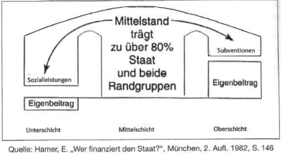 Die zweite Gruppe der Mittelschicht, der angestellte Mitteltand, sind die höher Qualifizierten, die Mehrleistenden und deshalb die "Besserverdienenden". Diese werden mit Steuerprogression überproportional belastet. Die Mittelschicht insgesamt trägt dadurch die Hauptlast aller direkten Steuern (63,1%), ebenso aller indirekten Steuern (52%) und der Sozialabgaben (56%) ⁶. Nimmt man deshalb den Steuerbeitrag der "Reichen" (17,1 %) aus, sind die mittelständischen Haushalte praktisch nicht nur die Hauptfinanzierer des Staates und der Sozialsysteme, sondern auch der unteren Schichtengruppe, welche sie mehr alimentieren müssen als diese selbst beitragen muss ⁷.