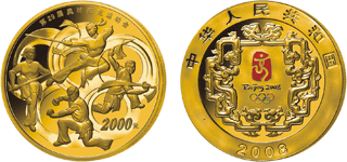 Darüber hinaus überrascht die 2. Serie der chinesischen Olympiamünzen mit zwei Sonder-Ausgaben. Zum einen erschien ein kostbares 5-Unzen-Stück (2.000 Yuan), passend zum Ausgabeanlass in 2.008 Exemplaren geprägt. Das Motiv zeigt vier Athleten bei der kunstvollen Ausübung chinesischer Kampfsportarten, wobei es den Münzdesignern gelungen ist, auch noch die fünf olympischen Ringe gekonnt zu integrieren. Zwei traditionellen Volkssportarten Chinas, dem Drachenboot- und dem Pferderennen ist die 1-Kilo-Silbermünze gewidmet. Der Edelmetallriese im Nennwert von 300 Yuan hat einen Durchmesser von 10 Zentimetern und wurde exakt 20.008 Mal geprägt.