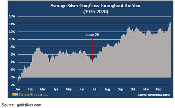 Ein weiterer Indikator dafür, dass nun ein großartiger Zeitpunkt ist, bullisch gegenüber Silber zu sein, ist dessen saisonaler Trend. Das Folgende ist ein 45-Jahreschart, von 1975 bis 2020, der den durchschnittlichen Silberpreistrend zeigt.