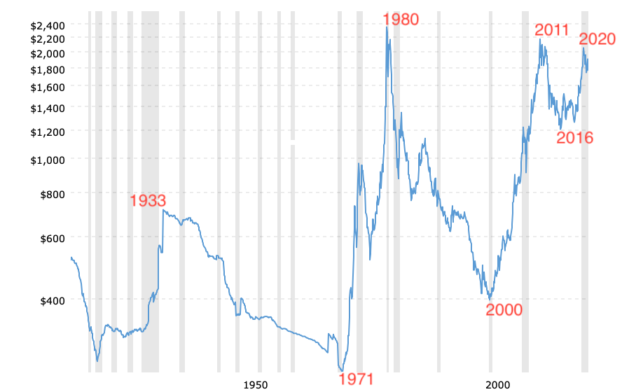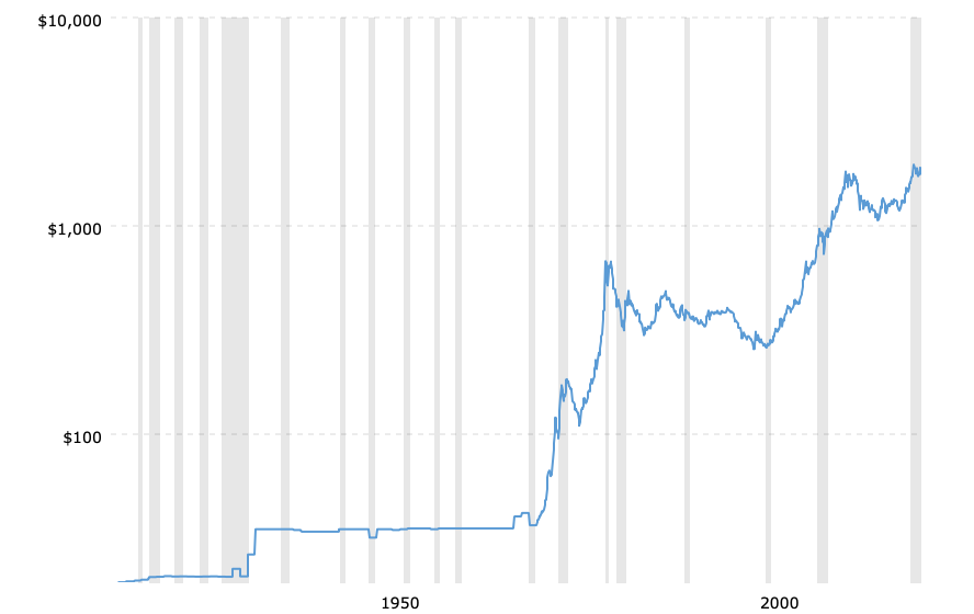 Seit der Gründung der Federal Reserve im Jahr 1913 hat der US-Dollar 99% seiner Kaufkraft verloren. Nicht zufällig, aber in direkter Widerspiegelung des Kaufkraftverlustes des Dollars, hat sich der Goldpreis von 20,67 Dollar je Unze auf 2.060 Dollar je Unze im August 2020 verhundertfacht. Der untenstehende Chart zeigt den stetig steigenden Goldpreis über das letzte Jahrhundert...