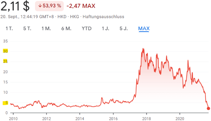Die Firma soll Verbindlichkeiten von 300 Milliarden USD haben, genau sei dies aber nicht bekannt. Der Aktienkurs ist seit 2017 von rund 30 HKD auf aktuell 2,11 HKD abgestürzt und der Börsenwert ist nur noch ein Bruchteil der vorhandenen Schulden:
