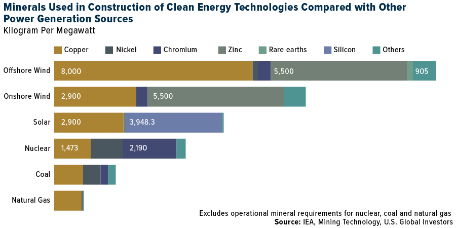 Werfen Sie einen Blick auf die folgende Grafik. Nach Angaben der Internationalen Energieagentur (IEA) verbraucht ein Offshore-Windpark neunmal so viele Ressourcen wie eine Erdgasanlage, wobei etwa 8.000 Kilogramm Kupfer benötigt werden, um nur ein Megawatt Strom zu erzeugen.