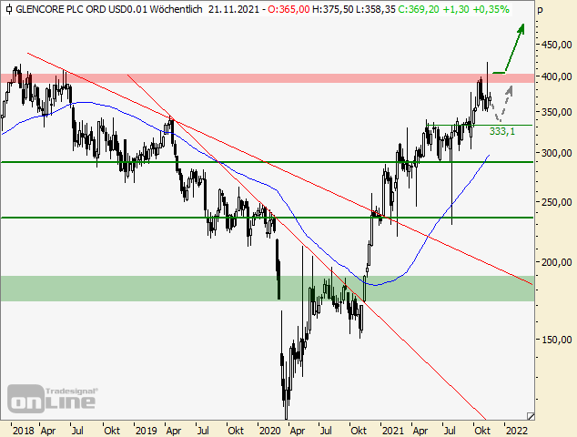 Die Aktie des Rohstoffunternehmens Glencore plc rappelte sich im Hinblick auf die letzte Analyse vom 6. August dann doch noch auf den Widerstand bei 330,00 Pence zu überwinden. Planmäßig wurde dabei in der Konsequenz der Widerstand bei 390,00/400,00 Pence attackiert und die Überwindung blieb bisher aus. Dieses Level bleibt jedoch im Blick, sodass insbesondere bei einer Etablierung darüber mit weiteren Zugewinnen zu rechnen ist. Die nächsten Ziele wären dann bei 450,00 bzw. 500,00 Pence zu finden.