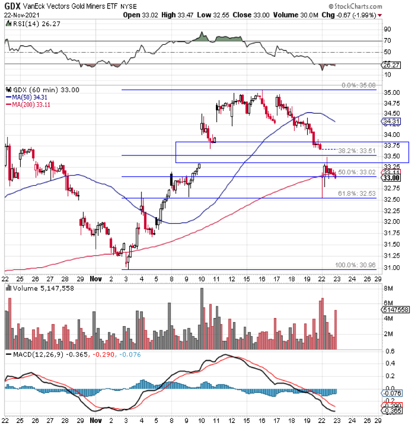 Der GDX hat dann gestern das GAP geschlossen und das mit viel Wucht, so dass ein neues GAP nach unten gerissen wurde. In der schwachen Eröffnung ging es exakt auf die 61,80% Fibonacci-Unterstützung zurück, die durchaus nochmals angetastet werden kann.