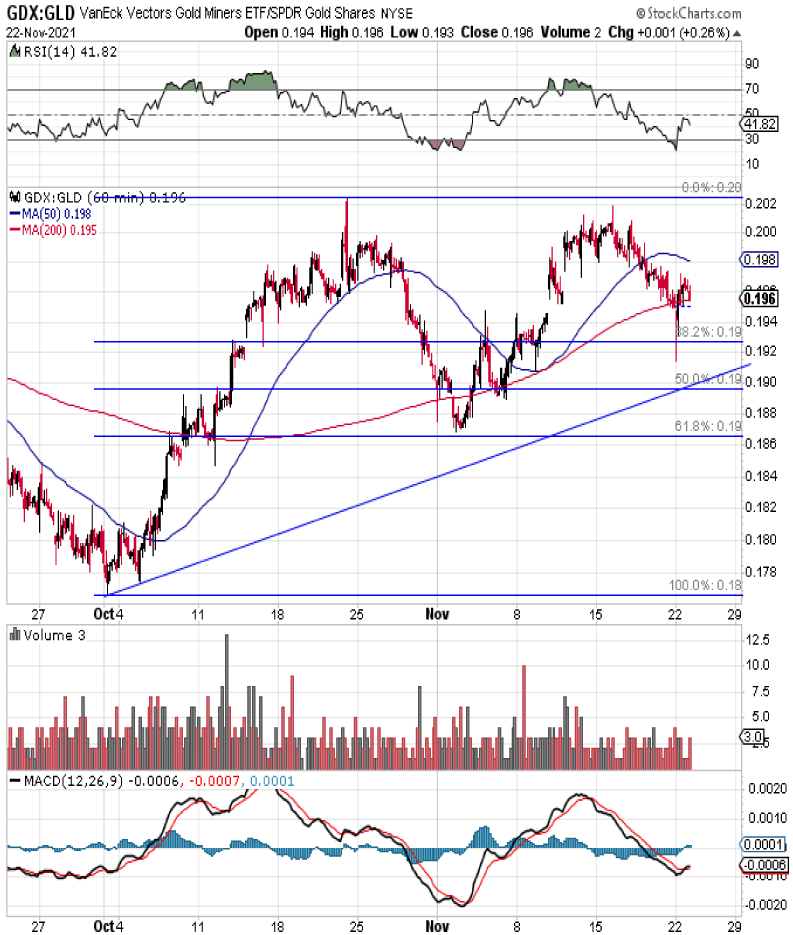 Die GDX-GLD-Ratio, die uns die relative Stärke oder Schwäche der Goldminen zum Goldpreis anzeigt, dippte zur Eröffnung kurz nach unten, lag dann aber zum Ende des Handels in der Pluszone. Ein Ausbruch dieser Ratio über 0,20 wird die nächste massive Kursrallye der Goldminenaktien auslösen: