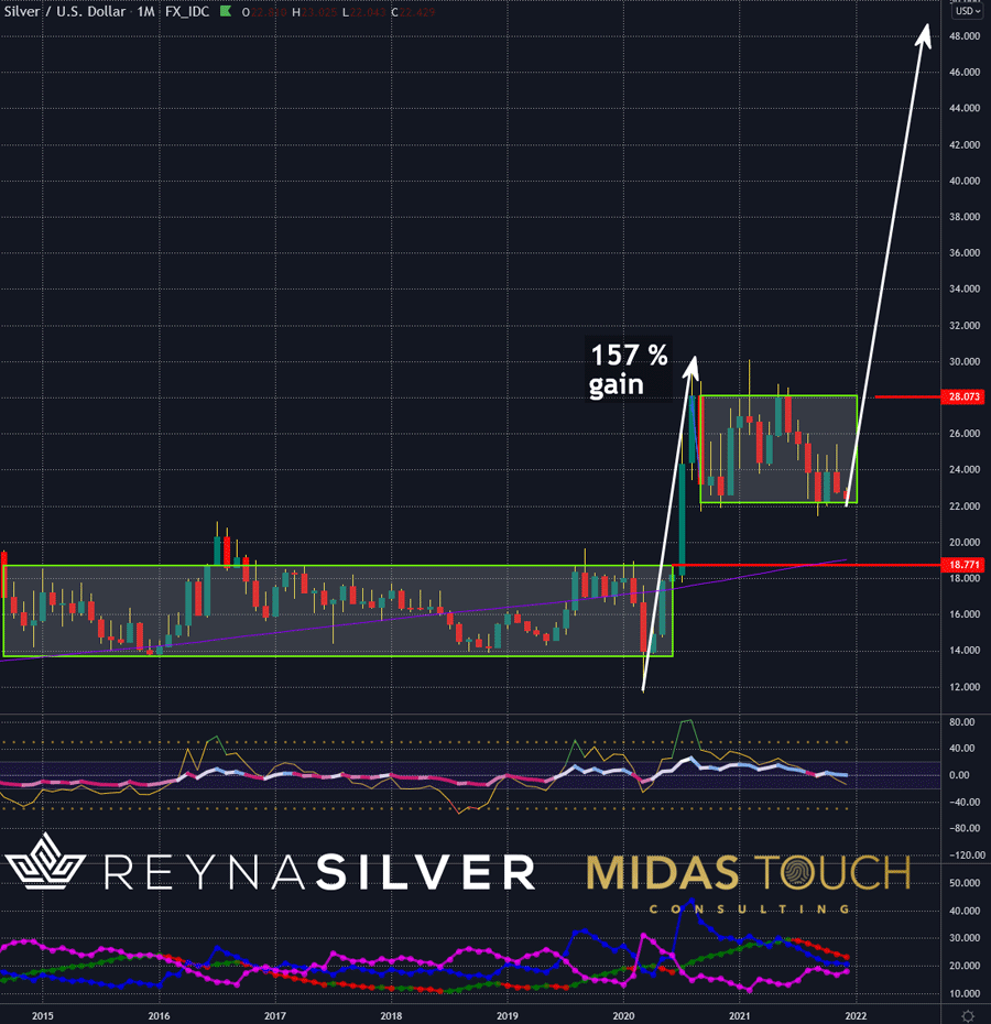 Tatsache ist, dass Silber in 2020 eine mehrjährige Seitwärtsspanne durchbrochen hat und stark gestiegen ist. Es hat sich nun seit über einem Jahr wieder in einer Seitwärtsspanne konsolidiert. Das ist ein bullisches Set-up!