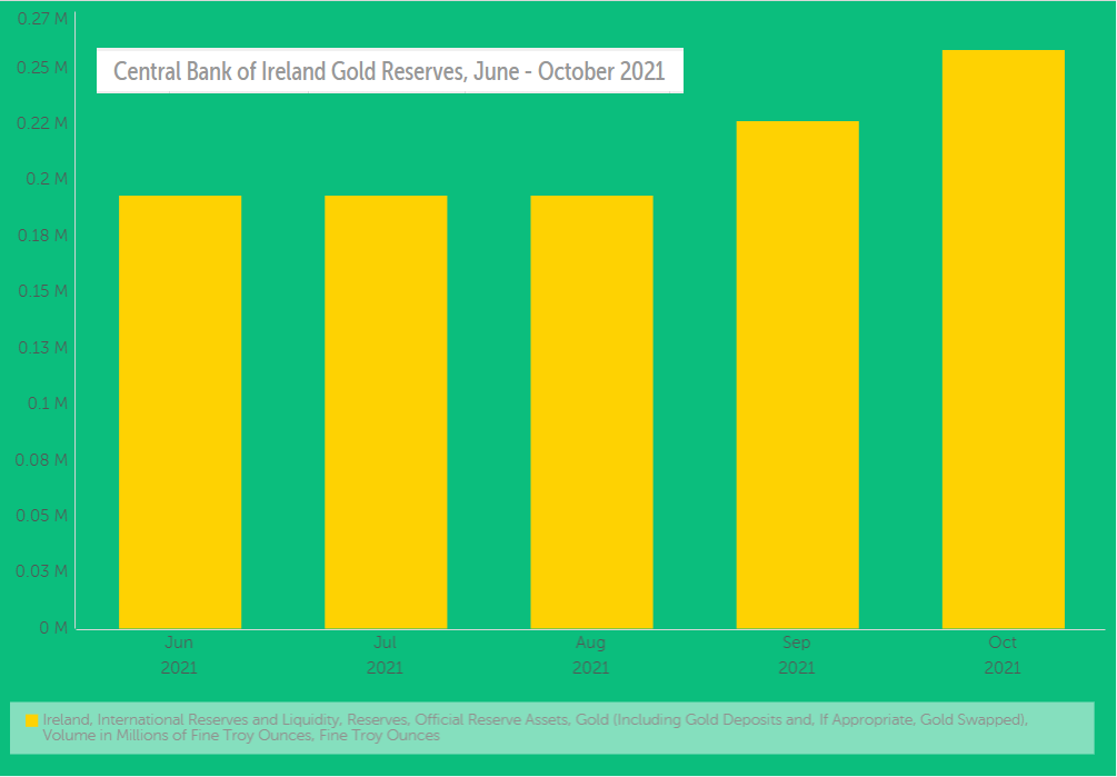 Vor kurzem hat sich die irische Zentralbank in die Riege der staatlichen Goldkäufer eingereiht und ihre monetären Goldreserven innerhalb von zwei Monaten um 2 Tonnen Gold aufgestockt, wobei sie im September und Oktober 2021 jeweils eine Tonne Gold kaufte. Relativ gesehen war die von der irischen Zentralbank hinzugefügte Goldmenge zwar recht gering, prozentual gesehen jedoch sehr groß, denn im August besaß Irland nur 6 Tonnen Gold (die angeblich bei der Bank of England gelagert wurden), und Ende Oktober verfügt Irland nun über 8 Tonnen Gold, d. h. eine Steigerung um 33% (für Kenner eine beachtliche Zahl).Diese jüngsten Goldkäufe der irischen Zentralbank sind auch deshalb bemerkenswert, weil es nicht oft vorkommt, dass eine Zentralbank, die a) ein westeuropäisches Land, b) ein Euro-Mitglied und c) ein OECD-Mitglied ist, Gold kauft. In diesem Fall treffen alle drei Punkte auf Irland zu. Während beispielsweise im Oktober 2021 drei der vier größten staatlichen Goldkäufer der Welt die bekannten Goldliebhaber Kasachstan (6 Tonnen), Indien (3,8 Tonnen) und Russland (3 Tonnen) waren, war der vierte, Irland (1 Tonne), nicht das, was man erwarten würde.