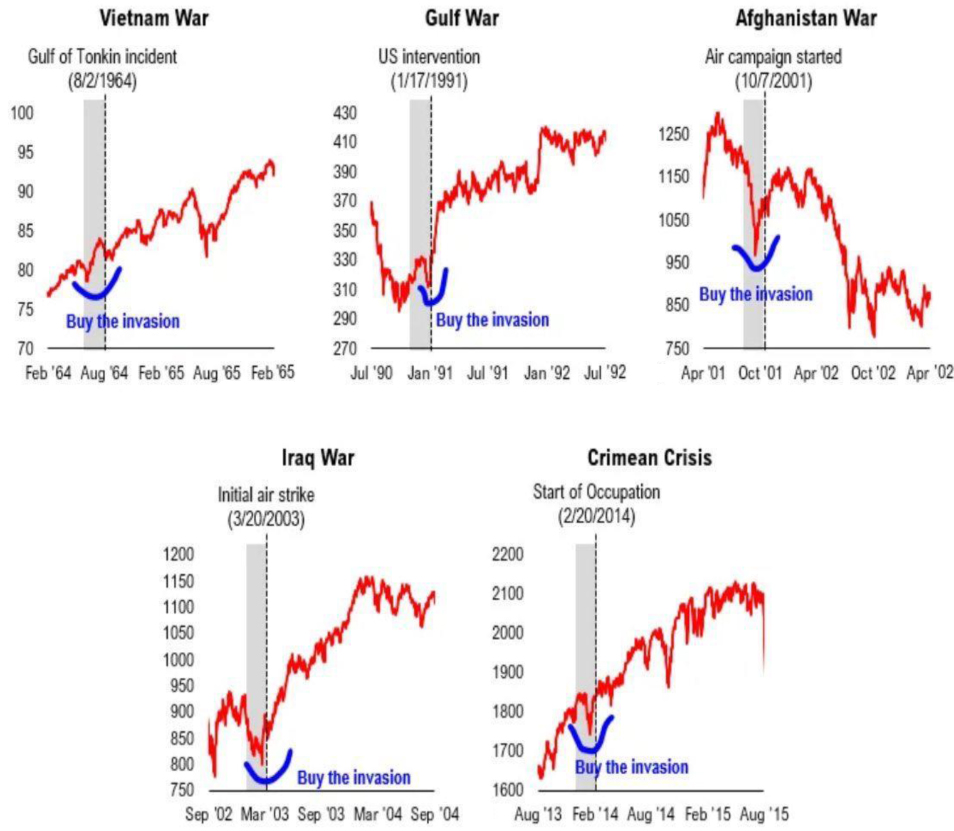 Nachfolgende Grafik habe ich für Sie gefunden. Sie zeigt das Verhalten der US-Aktienmärkte bei "Kriegsgeschehen“ und die Monate danach: