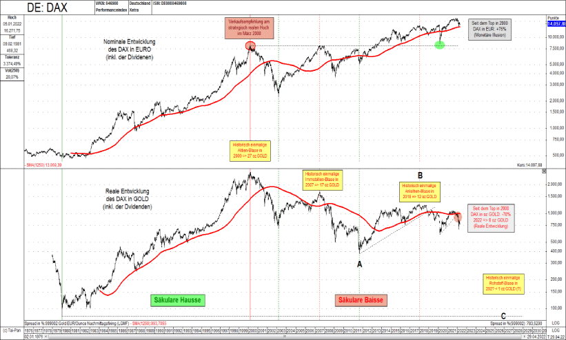 Abb. 1: DAX in EUR (oben) versus DAX in oz Gold (unten) von 01/1976 bis 04/2022