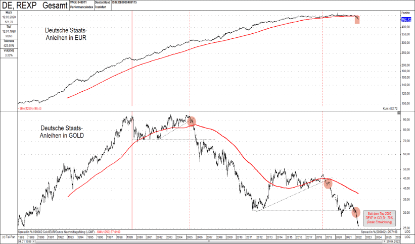 Abb. 2: REXP in EUR (oben) vs. REXP in oz Gold (unten) von 01/1988 bis 04/2022