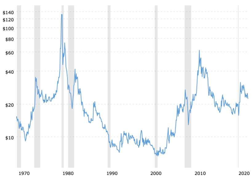 Ob der Silberpreis von hier aus nach oben oder nach unten geht, ist schwer zu sagen. Kurzfristig kann es in beide Richtungen gehen. Langfristig hat der Silberpreis jedoch noch viel Spielraum nach unten. Seit seinem Höchststand im Jahr 1980 hat der Silberpreis die Auswirkungen der Inflation nicht aufgefangen, geschweige denn echte Gewinne erzielt. Die Geschichte des Silberpreises stützt die aktuellen Erwartungen für höhere Preise nicht, aber es gibt einige schmerzhafte Beispiele für horrende Preisrückgänge.