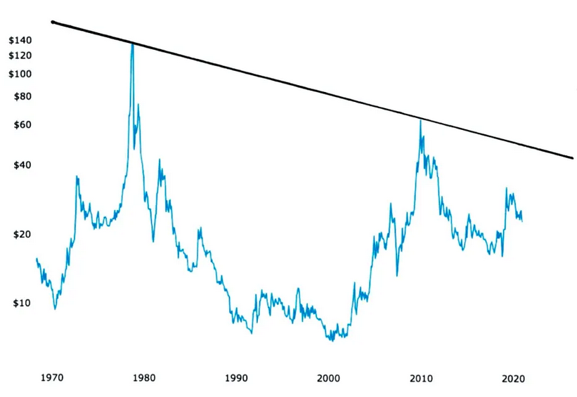 Aus dem Chart geht hervor, dass der Silberpreis mit zunehmender Inflation weiter unter Druck gerät. Wo ist der fundamentale oder technische Reiz bei dieser Art von Preisbewegung? Hier ist derselbe Chart mit einer zusätzlichen abwärts gerichteten Linie, die die wichtigsten Silberpreishöchststände seit 1980 verbindet...