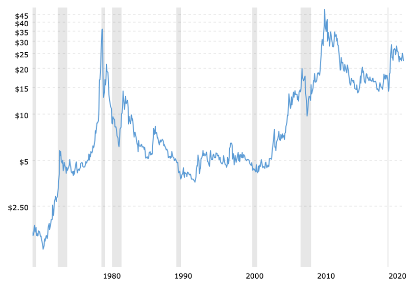 Die Preise für Silber sind in der Vergangenheit unabhängig von der Wirtschaftslage immer wieder gesunken. Während der Großen Depression (1930er Jahre) erreichte der Silberpreis einen Tiefstand von 0,28 Dollar je Unze. Einige Jahrzehnte später, mitten in der größten Periode des Wirtschaftswachstums in der Geschichte der USA (1980-2000), fiel der Silberpreis von fast 50 Dollar auf unter 3 Dollar. Das ist ein Rückgang von 94%, ohne die Auswirkungen der Inflation zu berücksichtigen.