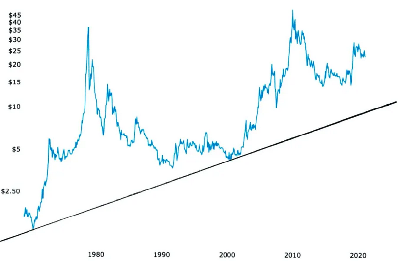 Der obige Chart zeigt den langfristigen Aufwärtstrend des Silberpreises seit Mai 1970 von 1,61 Dollar je Unze auf derzeit 22,31 Dollar je Unze. Es ist möglich, sich von den Zahlen beeinflussen zu lassen, aber die Zahlen sind ohnehin nicht so gut. Auf inflationsbereinigter Basis sind die Zahlen noch schlechter. Wenn man die Auswirkungen der Inflation berücksichtigt, beträgt der Anstieg nicht einmal 2:1 (22,31 Dollar geteilt durch 11,96 Dollar = 1,86).