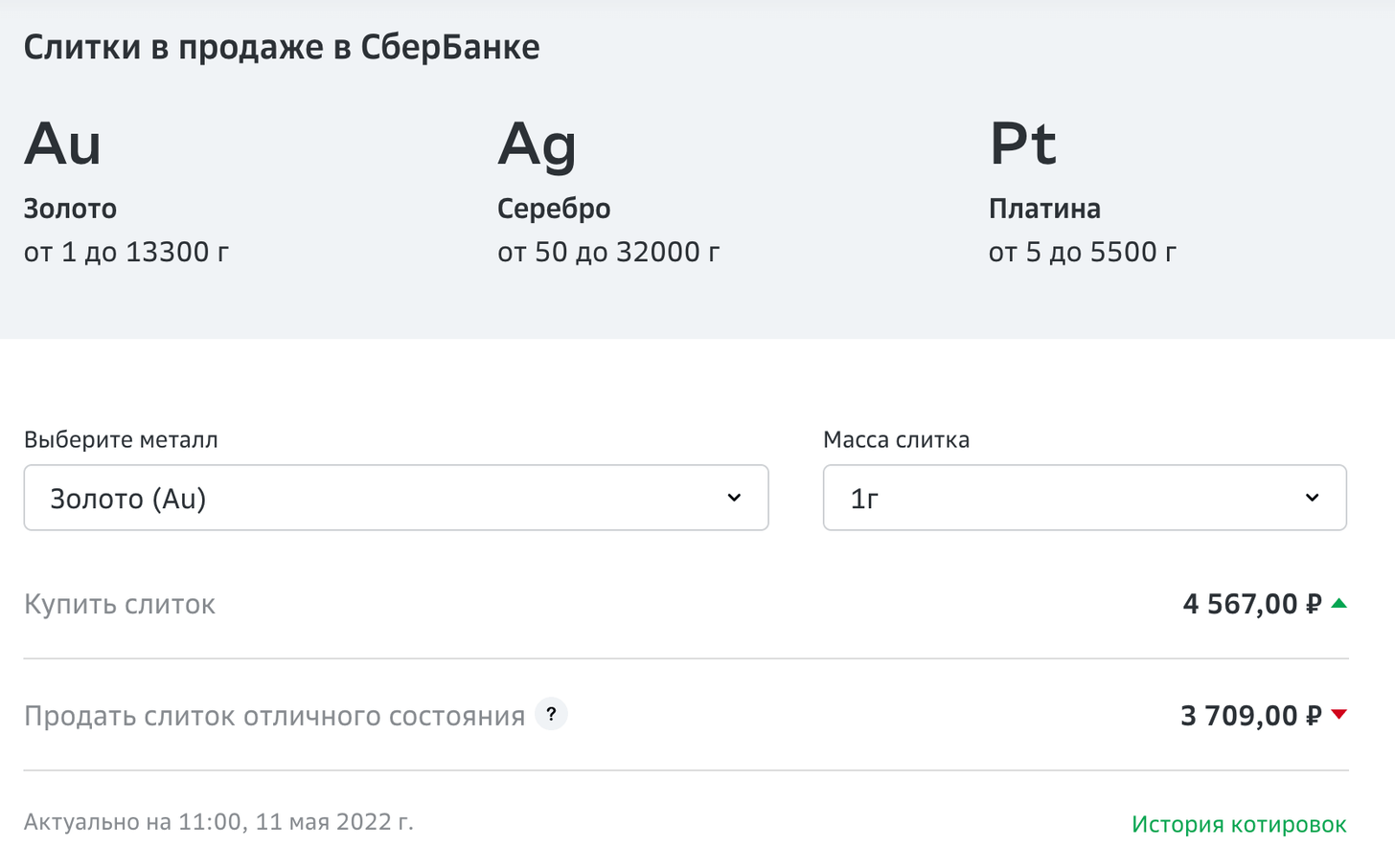 Wenn Sie dem Goldpreis im obigen Chart nicht glauben, weil er vom World Gold Council basierend auf inakkuraten Devisensätzen des Rubels kalkuliert worden könnte, dann betrachten Sie die unteren Preise des russischen Goldhändlers Sberbank. Am 11. Mai konnten Klienten Gold dort zu 4.567 Rubel je Gramm kaufen und zu 3.709 Rubel je Gramm verkaufen. Der durchschnittliche Marktpreis lag zu diesem Zeitpunkt bei 4.138 Rubel je Gramm: entsprechend der Preise vom World Gold Council.