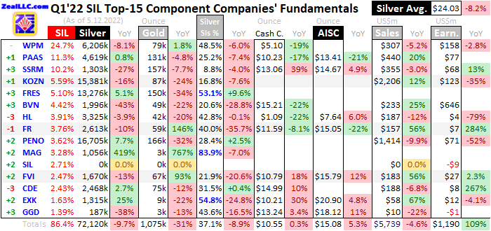 Diese Tabelle fasst die operativen und finanziellen Höhepunkte der 15 wichtigsten SIL-Unternehmen im ersten Quartal 22 zusammen. Die Aktiensymbole der großen Silberbergbauunternehmen sind nicht alle in den USA notiert und werden durch die Veränderungen in der Rangfolge innerhalb des SIL im vergangenen Jahr eingeleitet. Die Umschichtungen in ihren ETF-Gewichtungen spiegeln die sich verändernden Marktkapitalisierungen wider, die sowohl die Outperformer als auch die Underperformer seit Q1'21 offenbaren. Auf diese Symbole folgen die aktuellen SIL-Gewichtungen.