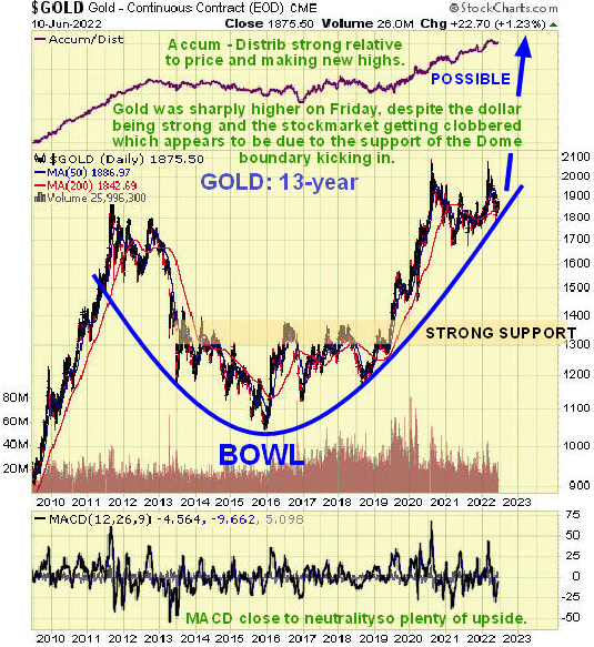 Auf dem 13-Jahreschart ist ersichtlich, warum Gold hier ausbrechen und zulegen würde: Das langwierige Konsolidierungsmuster von den Höchstständen im August 2020 hat dem Preis Zeit gegeben, die Begrenzung des gezeigten riesigen Bowl-Musters einzuholen, um den Preis nach oben zu treiben.