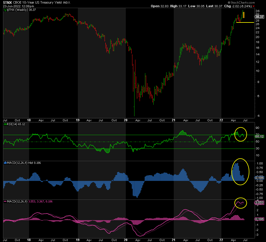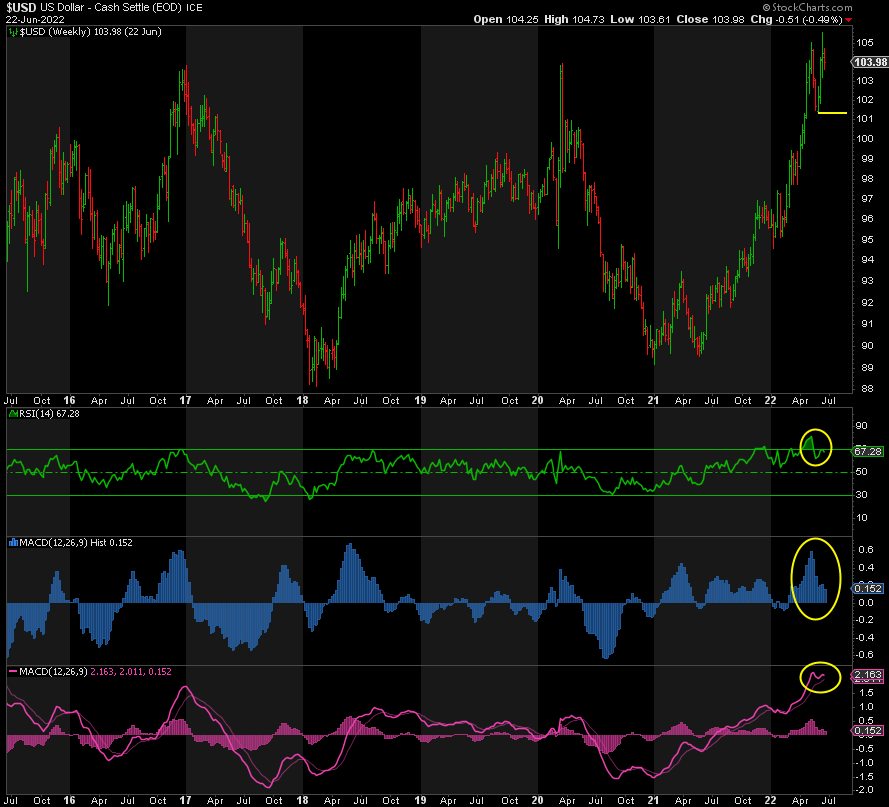 Der Dollar hat seit seinem Tiefststand von 89 im Januar 2021 einen großartigen Lauf hinter sich. Aber jetzt hat er über alle Indikatoren hinweg negativ divergierende Höchststände erreicht. Außerdem ist er extrem bullisch. Schauen Sie sich nur all die Twitter-Posts an, in denen ein nächster Kurs von 120 gefordert wird. Dies alles ist jedoch nur von geringer Bedeutung, wenn der DXY nicht die Unterstützung bei seinem vorherigen Tief von 101,42 durchbricht und anschließend unter 100 fällt.