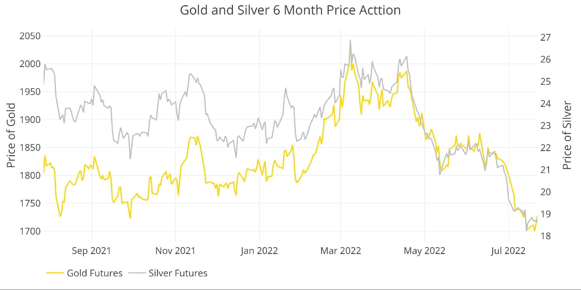 Die Preisanalyse vor zwei Monaten kam zu dem Schluss, dass sich zwischen 1.800 und 1.850 Dollar ein neutraler Markt gebildet hat, der auf einen Durchbruch des Widerstands oder der Unterstützung wartet. Die Indikatoren deuteten darauf hin, dass die Abwärtsbewegung ihren Lauf genommen hatte, aber es wurde auch auf das Risiko hingewiesen, dass ein Rückgang unter 1.800 Dollar und 1.750 Dollar die 1.680 Dollar ins Spiel bringen würde. Im letzten Monat kam man zu dem Schluss, dass der Goldpreis zwar immer noch zwischen 1.800 und 1.850 Dollar gefangen war, aber eine solide Unterstützung aufgebaut hatte. Leider fiel der Goldpreis bei 1.800 Dollar durch die Falltür und testete letzte Woche 1.680 Dollar. Wurde ein Boden gefunden? Es ist noch zu früh, um das zu sagen, aber ein Blick auf die Indikatoren könnte einige Anhaltspunkte liefern.